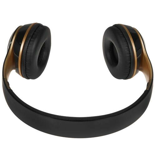 Стильное сочетание цветов корпуса – черный и золотистый. Удобные мягкие амбушюры и вообще сама конструкция голову не сдавливает. Складываются и тогда их можно удобно носить с собой. В корпус встроен мр3 плеер, радио и кардридер. Поэтому наушники вполне могут работать как самостоятельный проигрыватель без подключения к другим устройствам. Подключаются наушники по блютуз и по проводу к обычному входу для наушников (кабель с наушниками в комплекте)