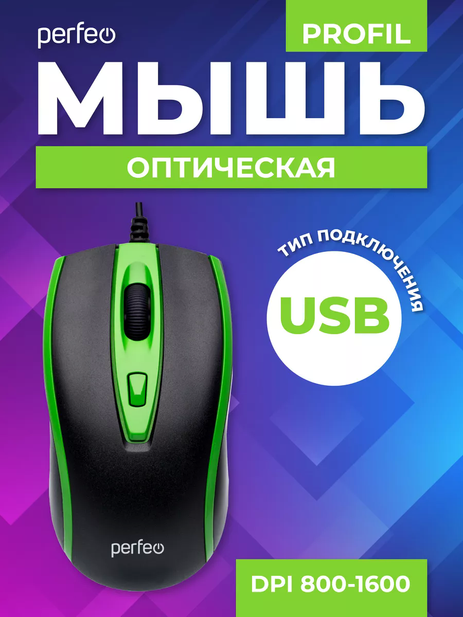 Мышь Perfeo оптическая "PROFIL", 4 кн, USB, чёрн-зел (PF-383-OP-B/GN)