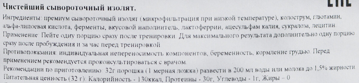 | Плюсы: | Отличный изолят! Очень нравится вкус Бразильский кофе. Пью его по утрам вместо завтрака с декабря месяца. Шикарный вкус. Как будто пью хороший кофе, а не протеин. Пью его на обезжиренном безлактозном молоке Parmalat 0,5% жирности. Так как пить протеин на воде, это дикость и вкус получается не тот. Хороший аминокислотный состав на порцию. Радует что изолят хорошего качества, и нет жиров и углеводов, менее 1 грамма сахара. Шикарный протеин. Производство США. Всегда беру всё спортивное питание зарубежное, так как соответствие этикетке 98 %. А у нас фиг знает что ложат. Берите, не пожалеете. |