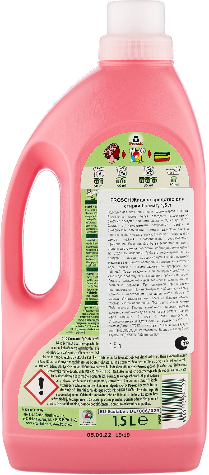 Жидкость для стирки Frosch Гранат, 1.5 л, бутылка