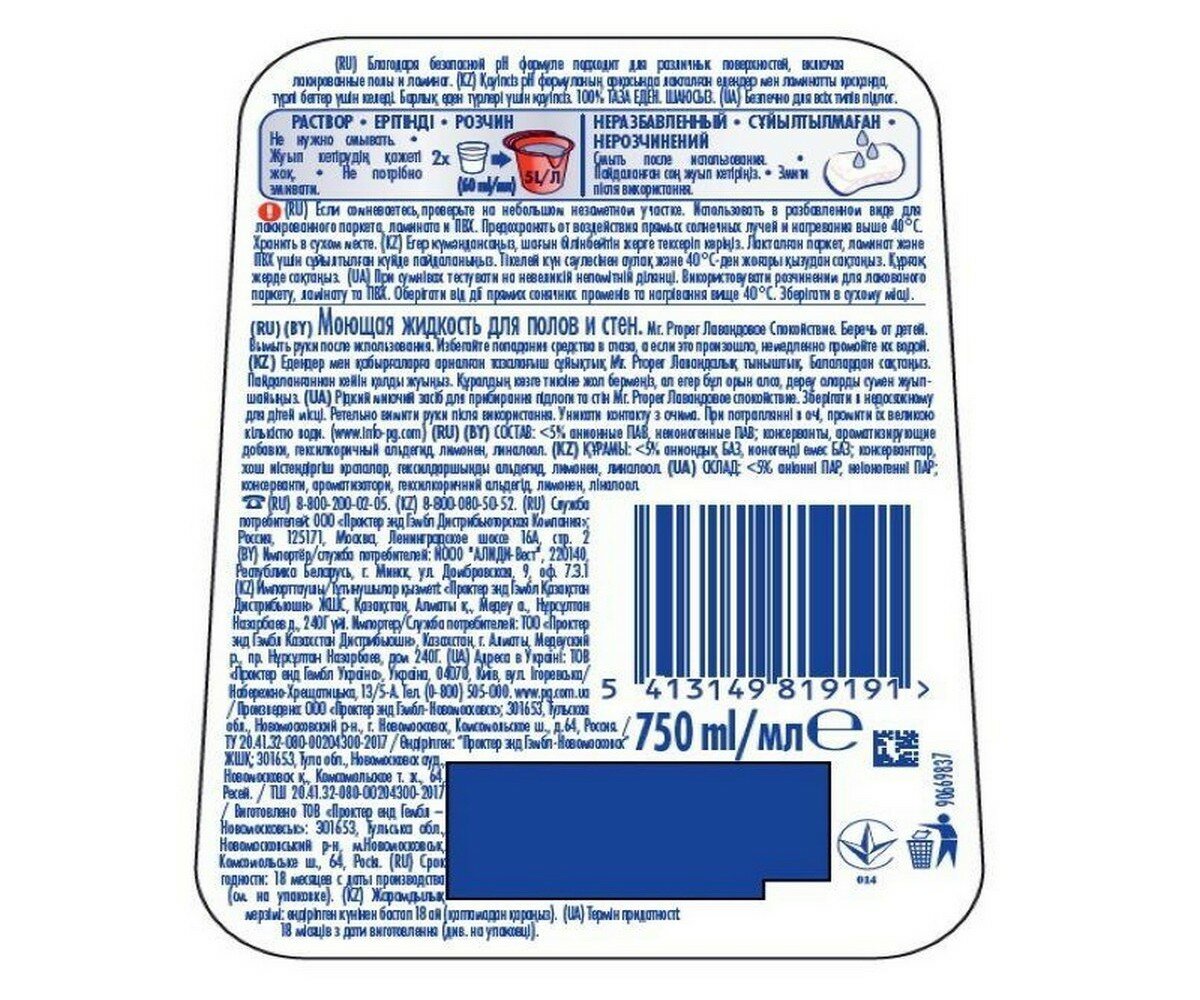 Средство для мытья пола и стен Mr. Proper 750 мл, "Лавандовое спокойствие" ()