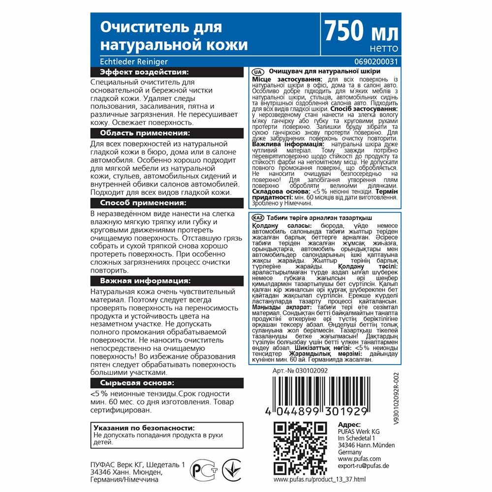 Очиститель для натуральной кожи PUFAS Glutoclean 750 мл интересное: