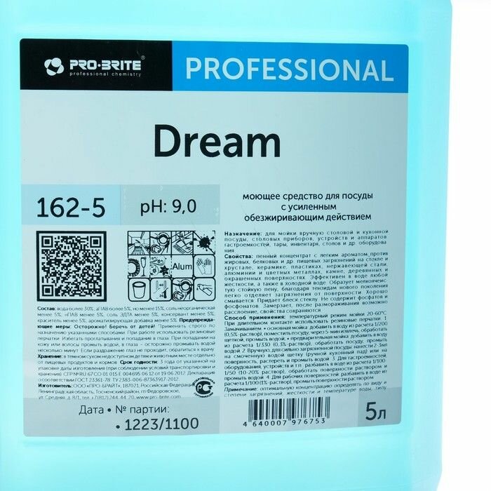 Моющее ср-во для посуды с усил. обезжир. дейст. 162-5 Dream 5л Pro-Brite