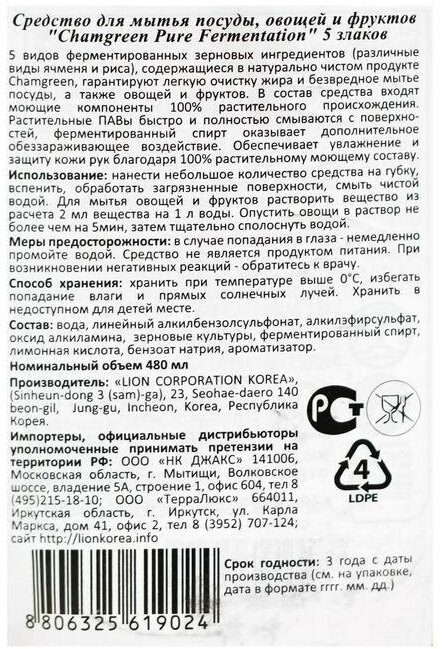 Lion CHARMGREEN Pure Fermentation 480 мл. Средство для мытья посуды, овощей и фруктов (5 злаков)