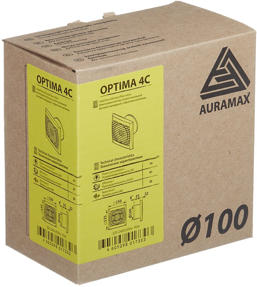 Вентилятор осевой вытяжной Auramax Optima 4C, с обратным клапаном, d 100, 14 Вт