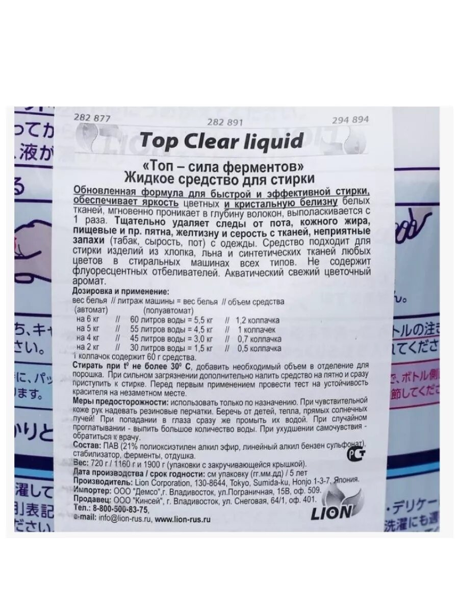 Lion top clear liquid жидкое средство для стирки белья, сила ферментов, 900 мл