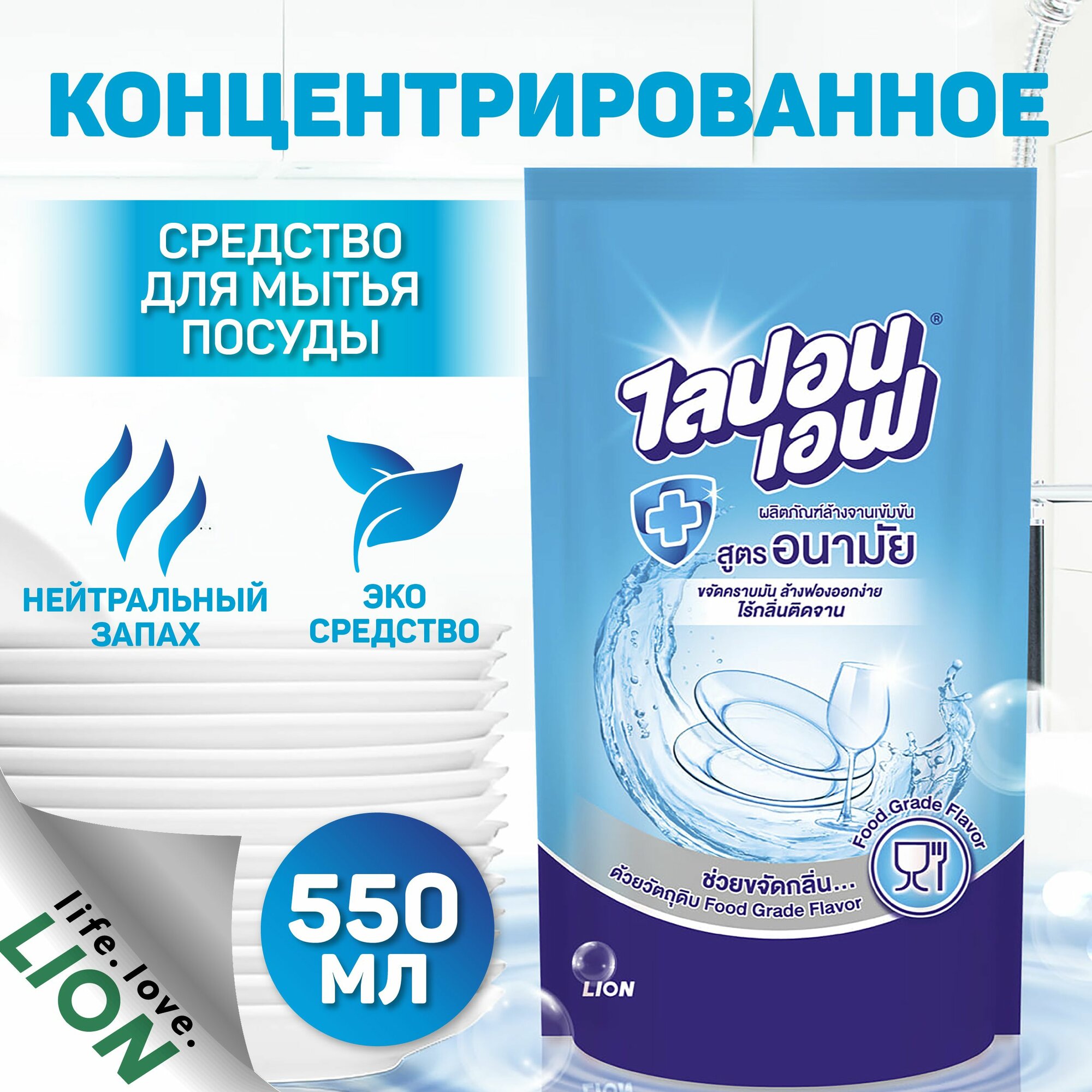 LION Средство для мытья посуды / гель для мытья посуды 550мл мягкая упаковка / Lipon F Таиланд