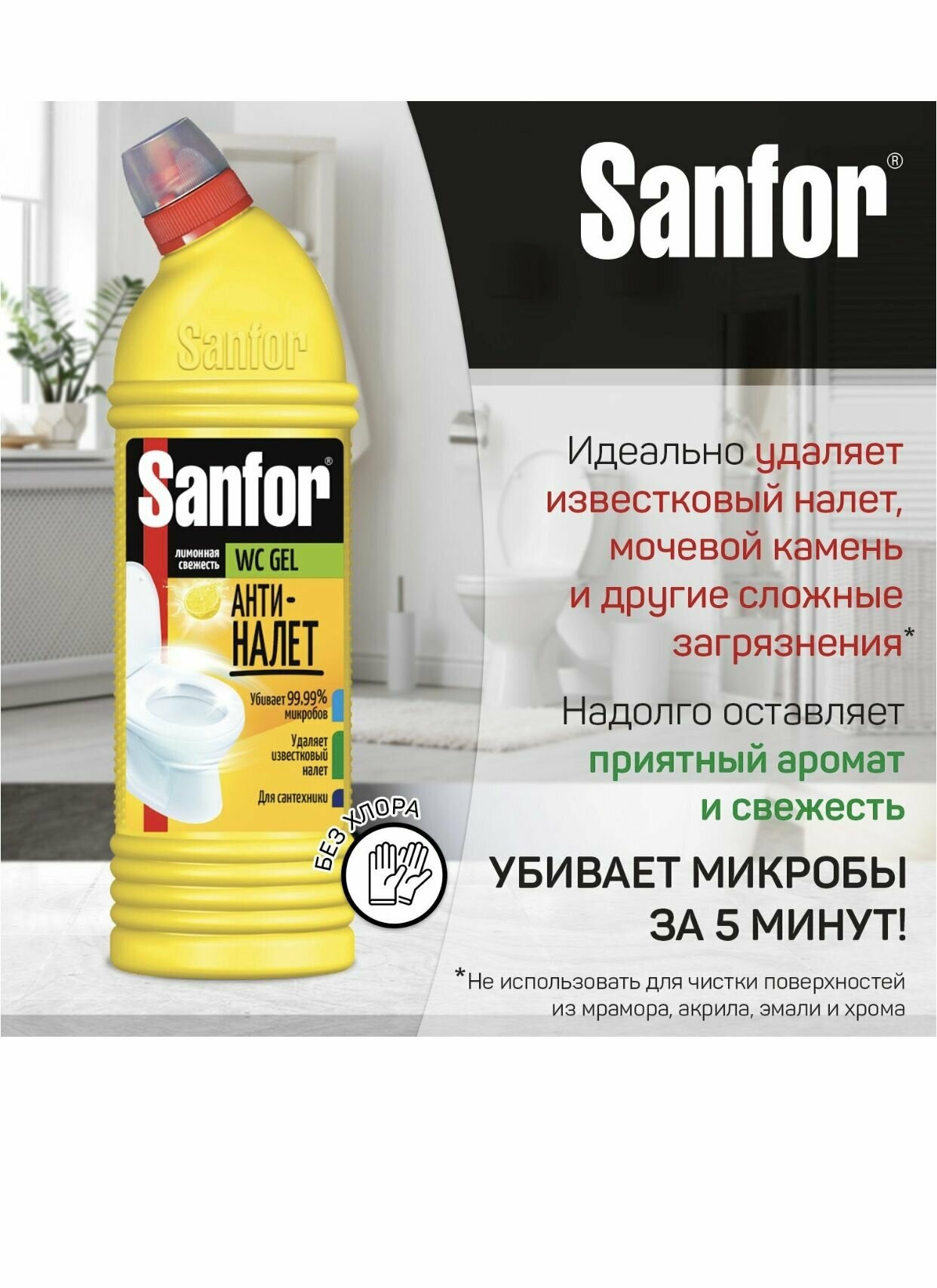 Санфор / Sanfor WC Gel - Гель для чистки сантехники жидкий Антиналет Лимонная свежесть 750 г