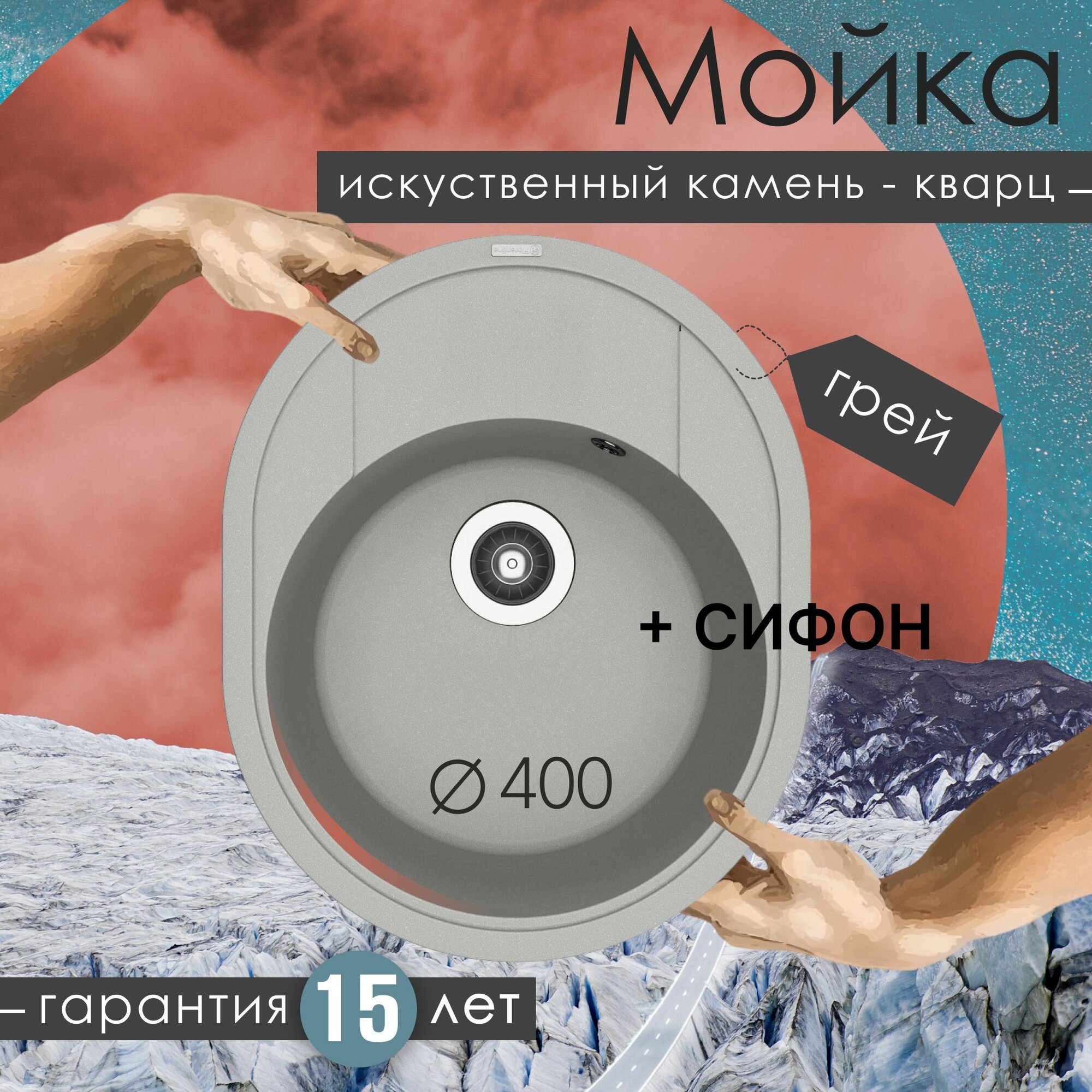 Мойка для кухни врезная каменная Florentina РОДОС-580, цвет грей, с крылом, овальная, 580х470х217 мм