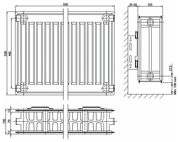 Радиатор, ERK 22, 100*500*600, RAL 9016 (белый) Elsen