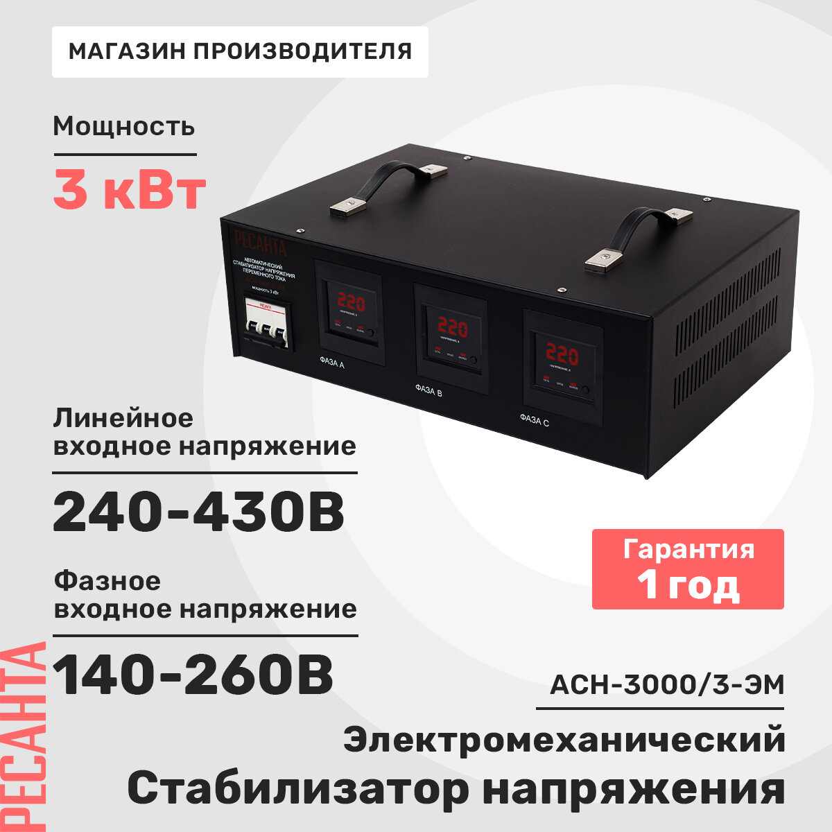Стабилизатор напряжения РЕСАНТА АСН-3000/3-ЭМ, 240 В-430 В, 3 кВт