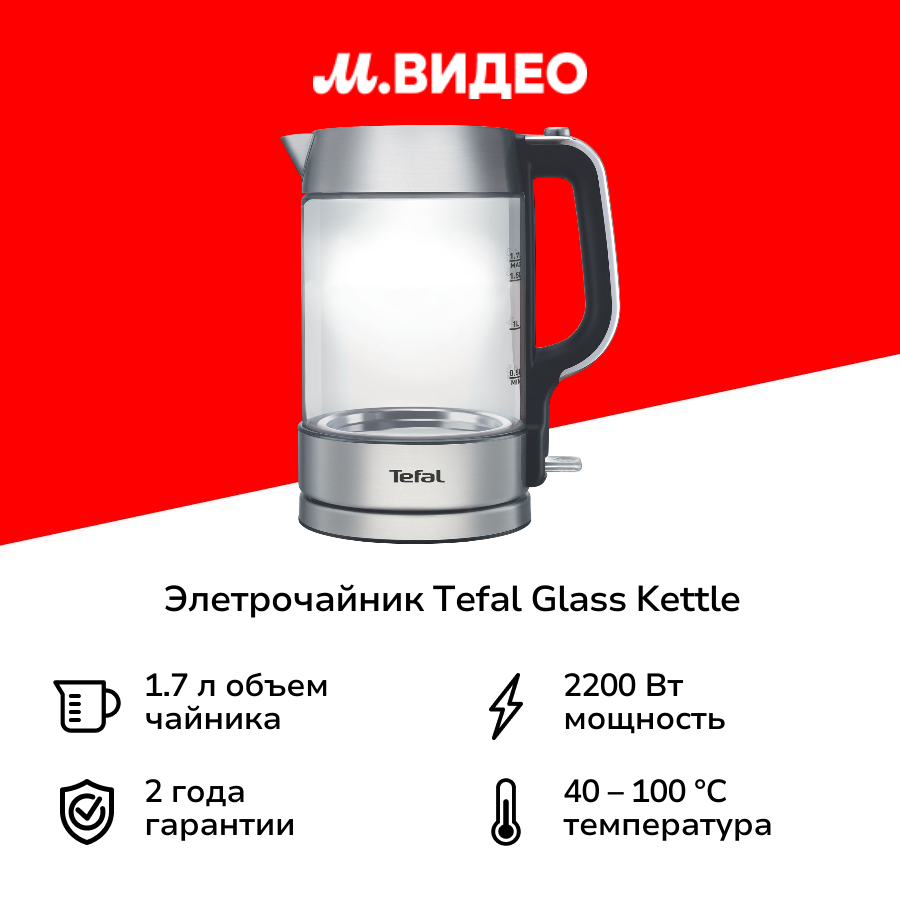 Электрический стеклянный чайник Tefal Glass Kettle KI770D30 1,7 л с подсветкой, индикатором уровня воды, 2200 Вт, серебристый интересное: