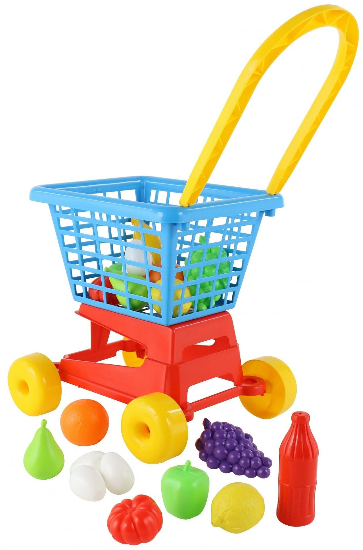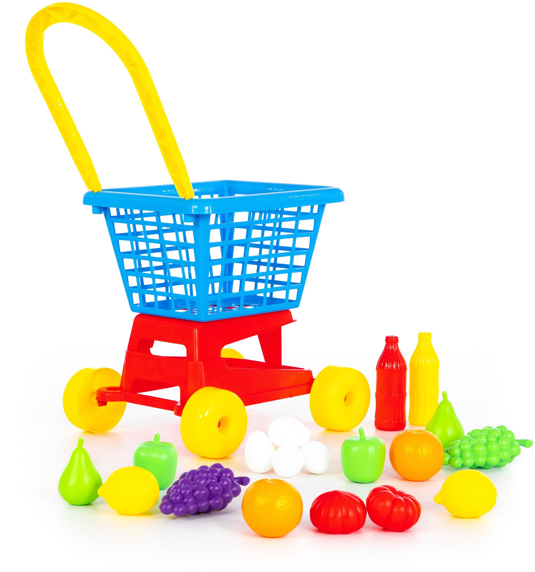 Детская тележка для покупок Полесье Supermarket (тележка для маркета - высота ручки 62 см) для игры в магазин с 5-ю яичками, 6 овощами, 6 фруктами и 2 бутылочками