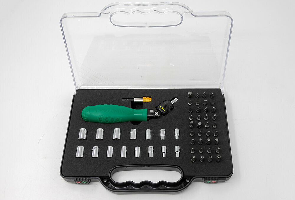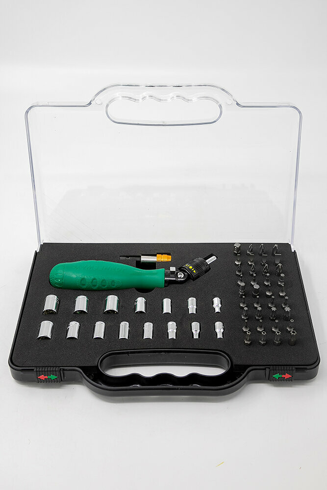 DR0253S Рукоятка отверточная трещоточная с гибкой головкой в наборе с битами и головками, 53 предмета