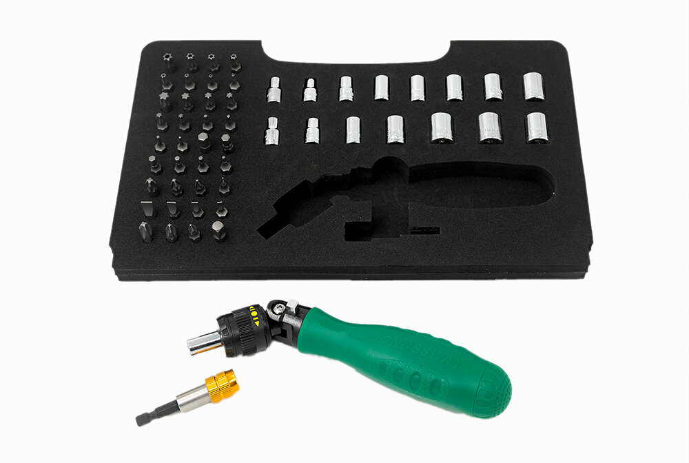 JONNESWAY DR0253S Рукоятка отверточная трещоточная с гибкой головкой в наборе с битами и головками, 53 предмета