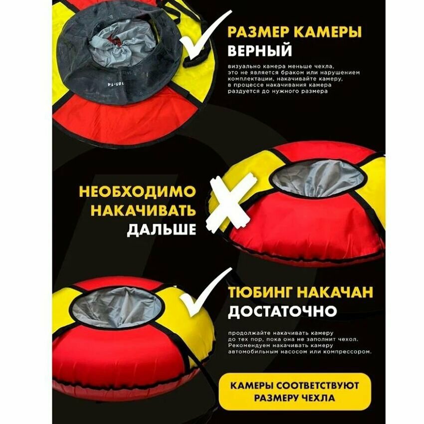 | Отзыв: | Качал автомобильным насосом до полного заполнения, чехла. Инструкция внутри тюбинга. Вес 70 кг держит нормально. Поцарапался низ Тюбинга при езде с больших горок не полностью накатаневх снегом. |