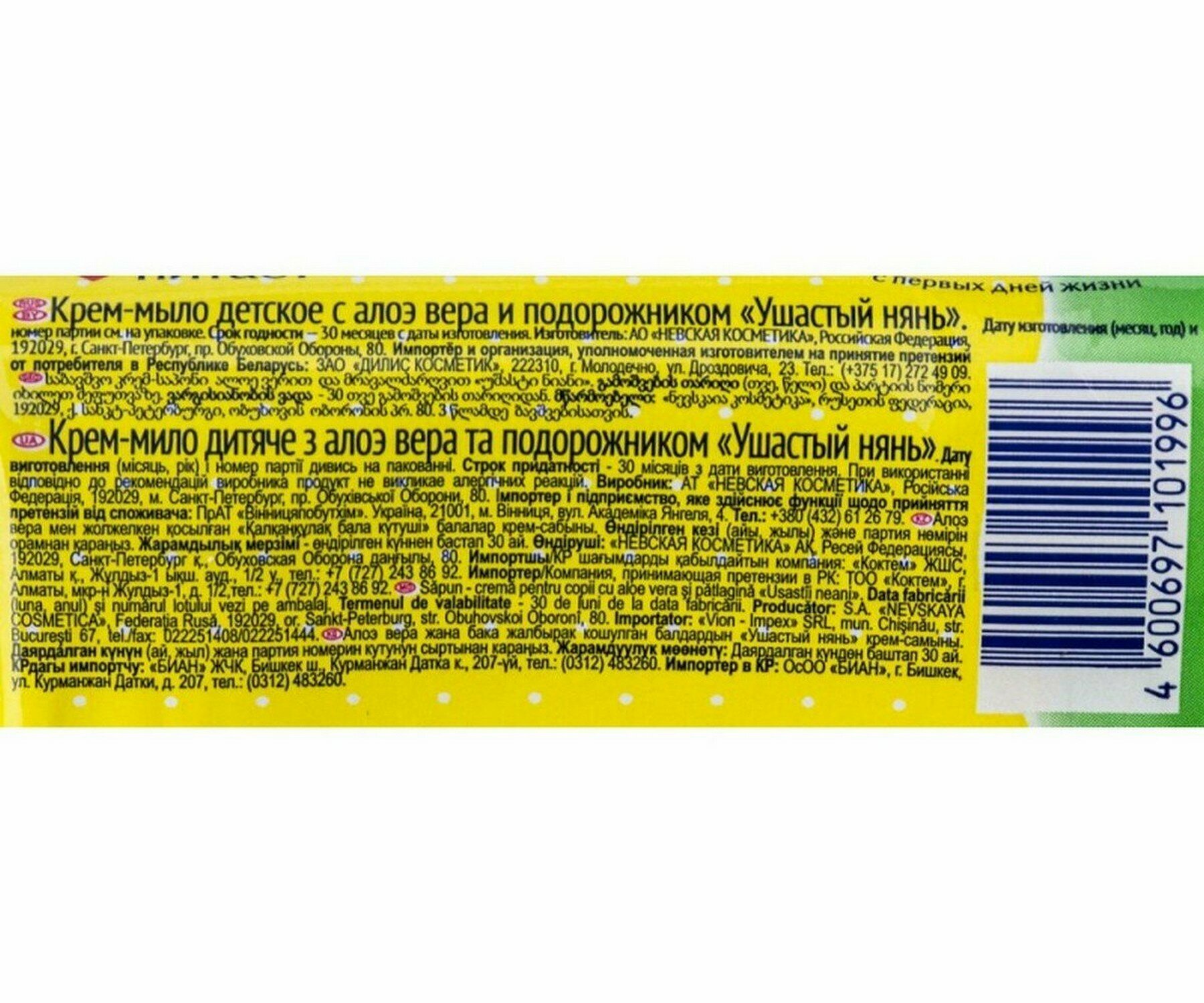 | Отзыв: | Крем-мыло детское с алоэ вера и подорожником под торговой маркой «Ушастый нянь» произведено ОАО «Невская Косметика» в России. Образец был приобретен в ЗАО «Торговый дом “Перекресток”» (гипермаркет «Карусель») по адресу: г. Москва, пр-т Андропова, д. 8а.