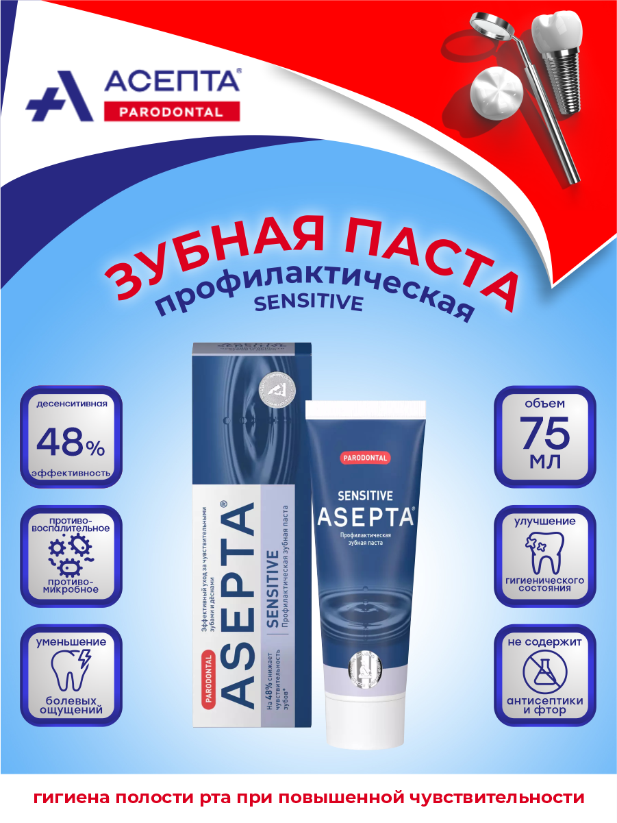 Асепта Зубная паста "Асепта Sensitive", лечебно-профилактическая, 75 мл