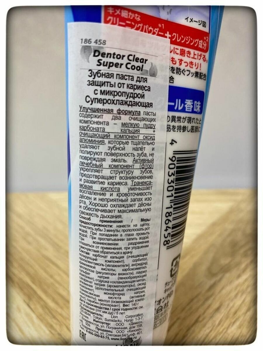 LION Зубная паста Dentor Clear Super Cool для защиты от кариеса с микро пудрой, супер охлаждающая, 140 г