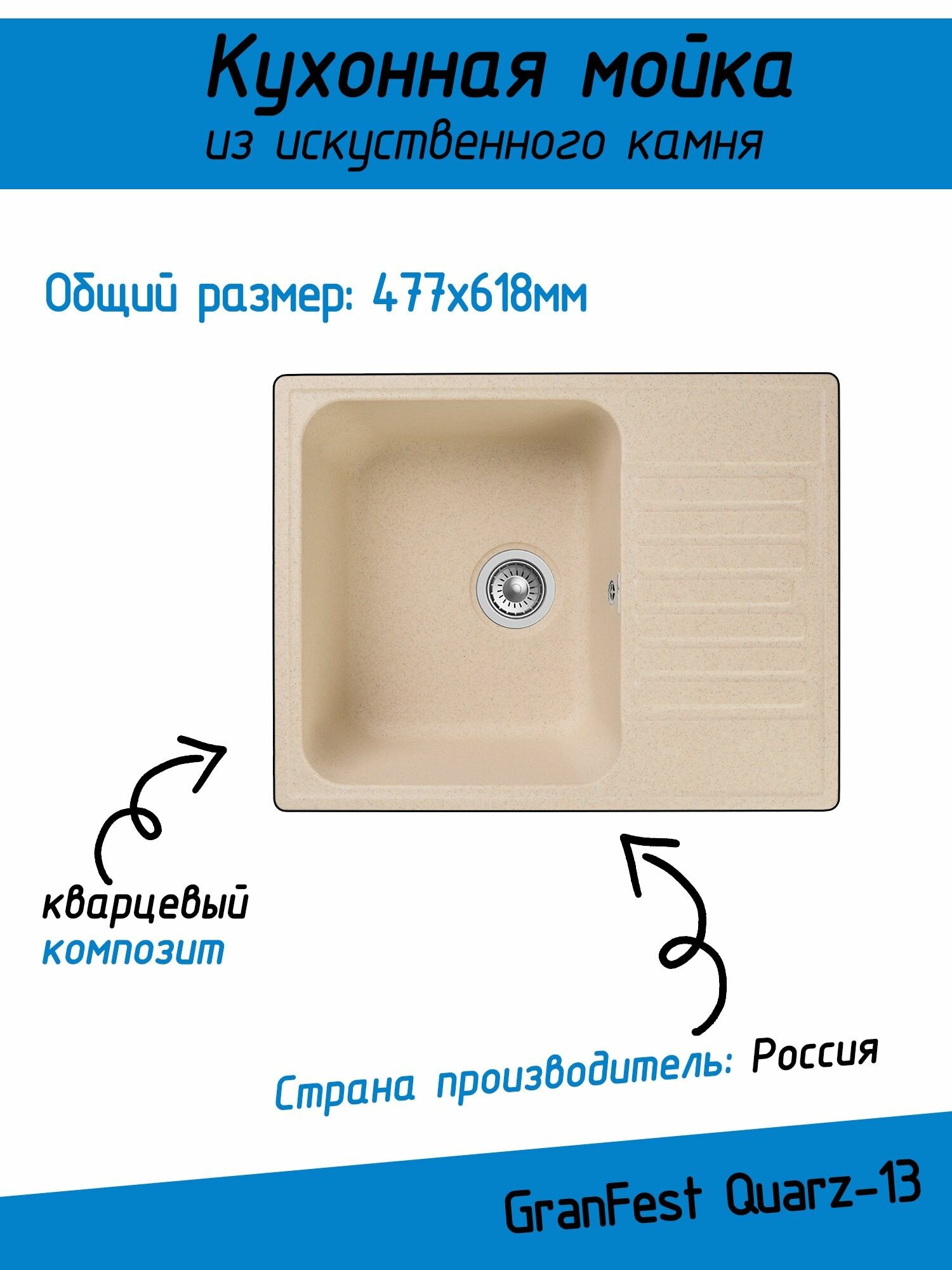 Кухонная мойка GRANFEST Quarz GF-Z13, кварц, 47.7см х 61.8см, бежевый [gf-z13-328]