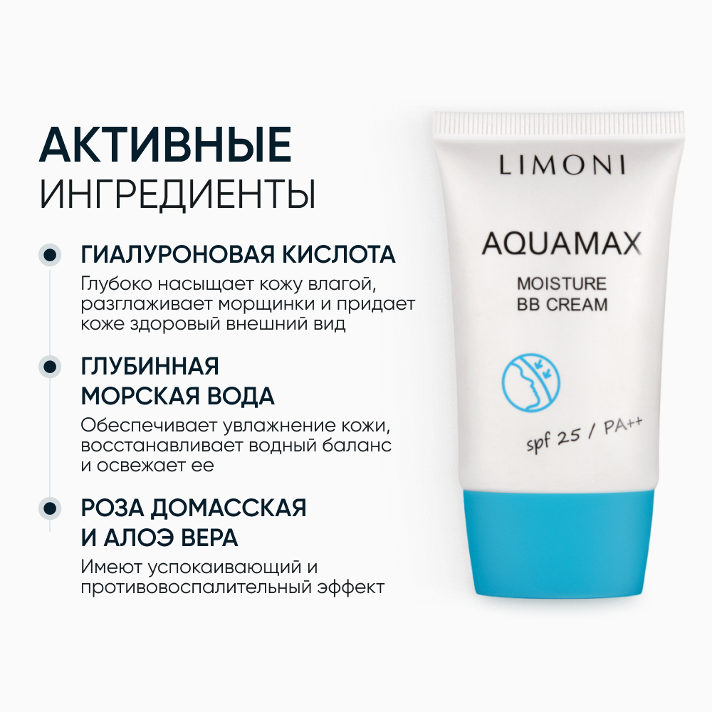 LIMONI Тональный bb крем для лица Корея увлажняющий и выравнивающий тон кожи / AQUAMAX MOISTURE SPF 25 PA++ тон №1, 15 мл