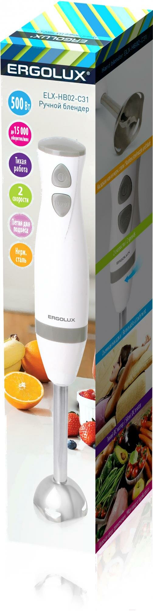 ERGOLUX ELX-HB02-C31 бело-серый (блендер, нерж.сталь, 2 скорости, 500Вт, 220-240В) (1 шт.)