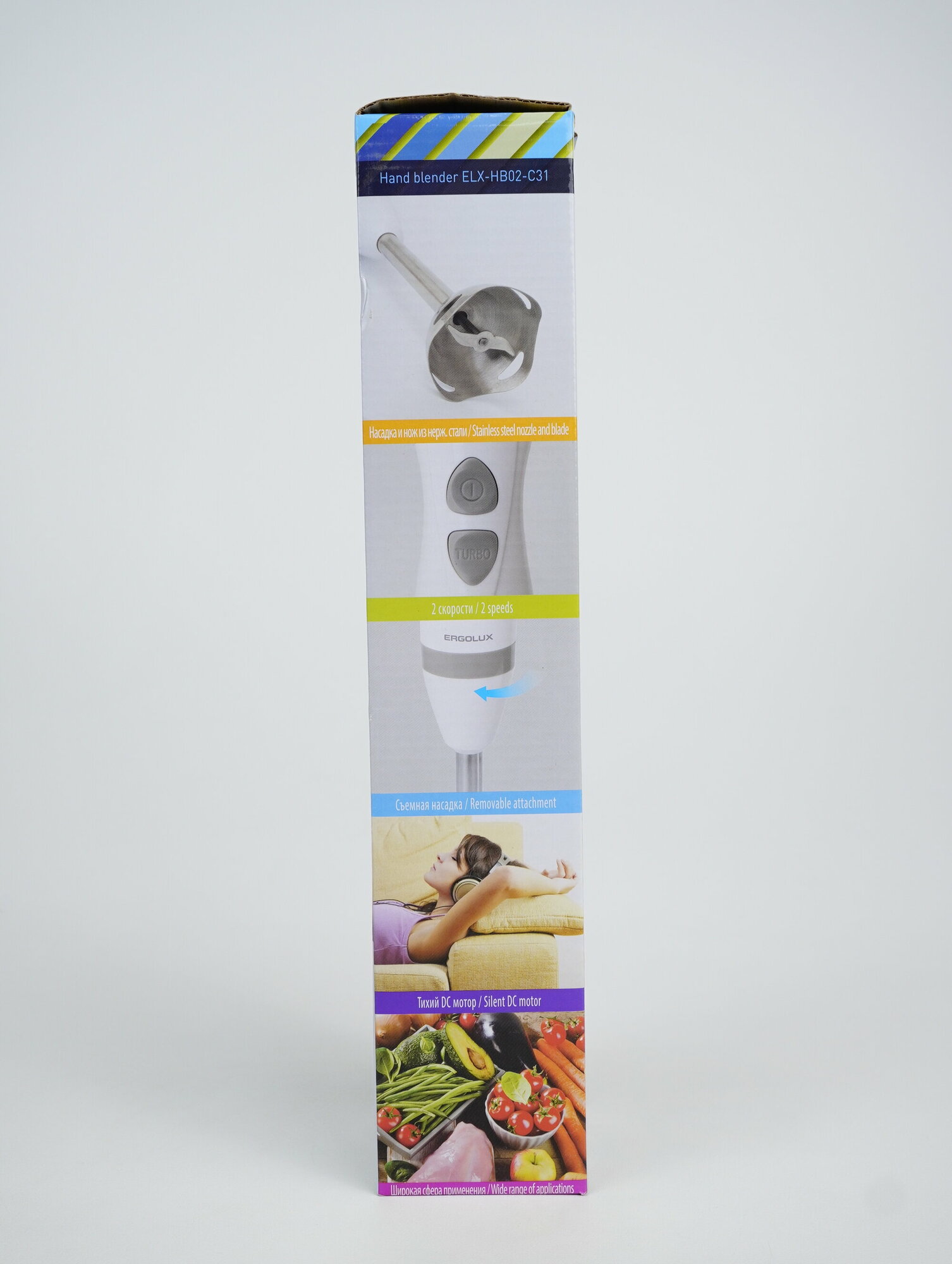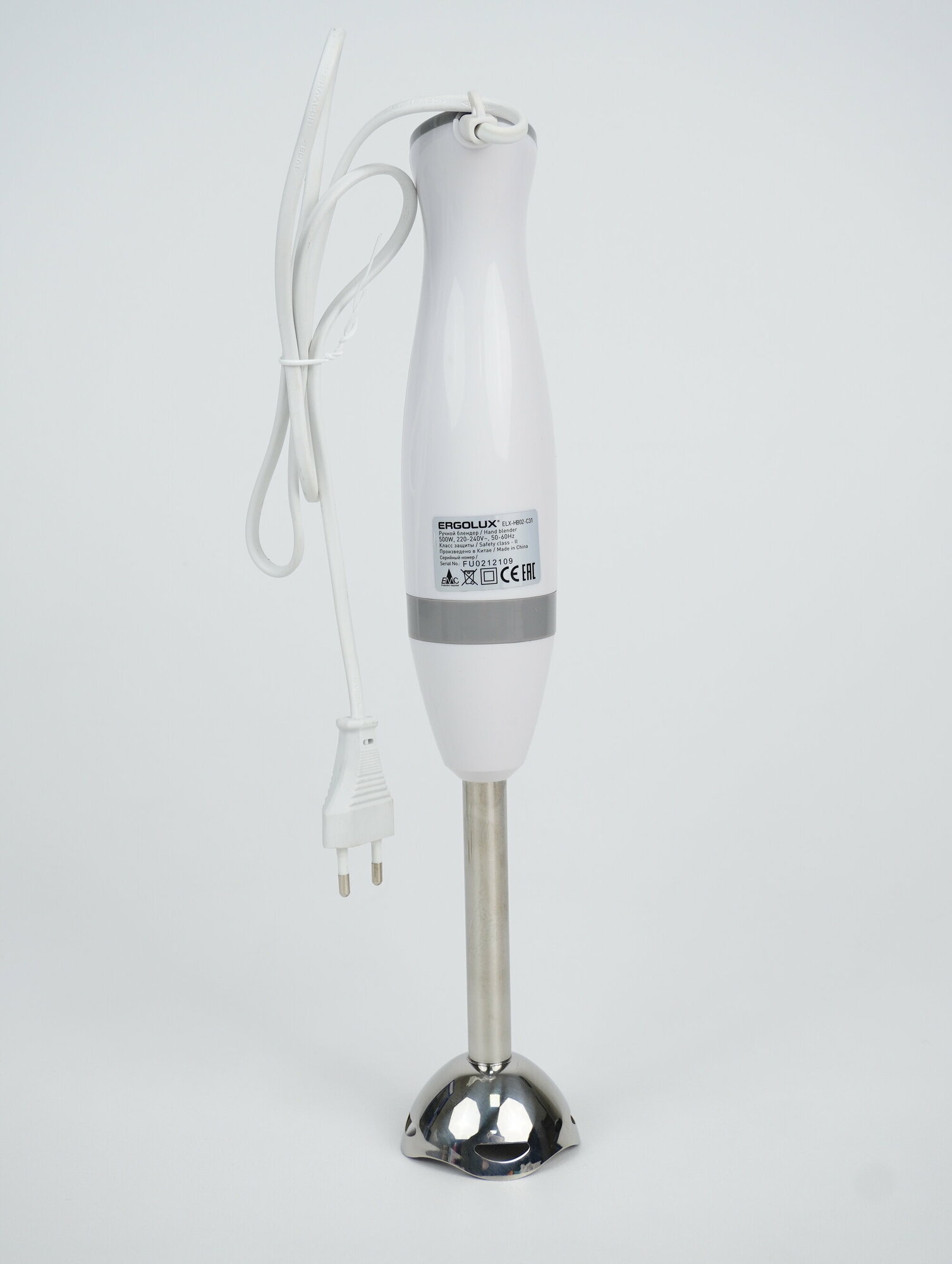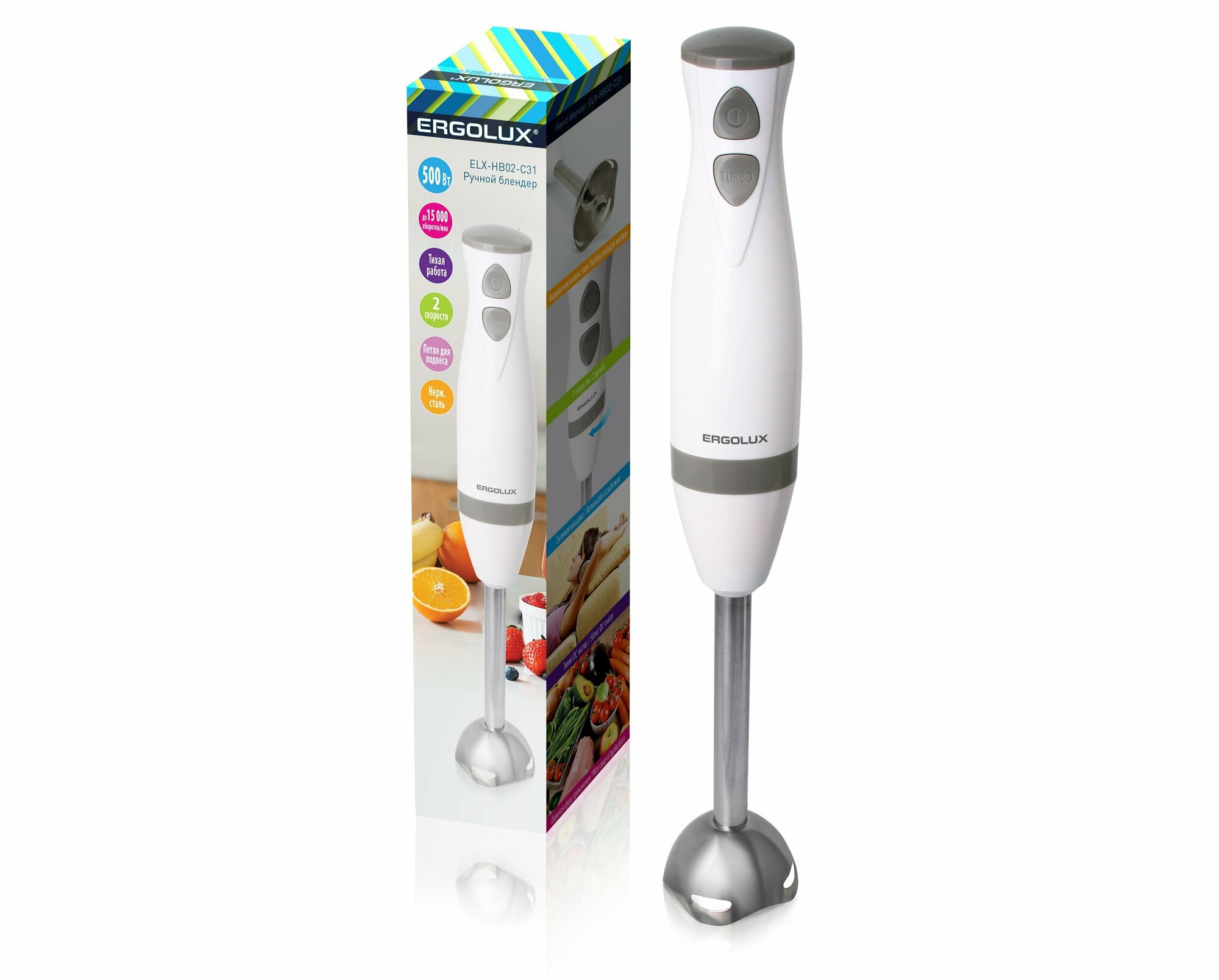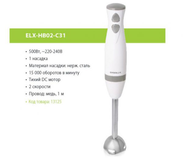 Блендер ручной ELX-HB02-C31 бело-серый (нерж.сталь, 2 скорости, 500Вт, 220-240В) ERGOLUX