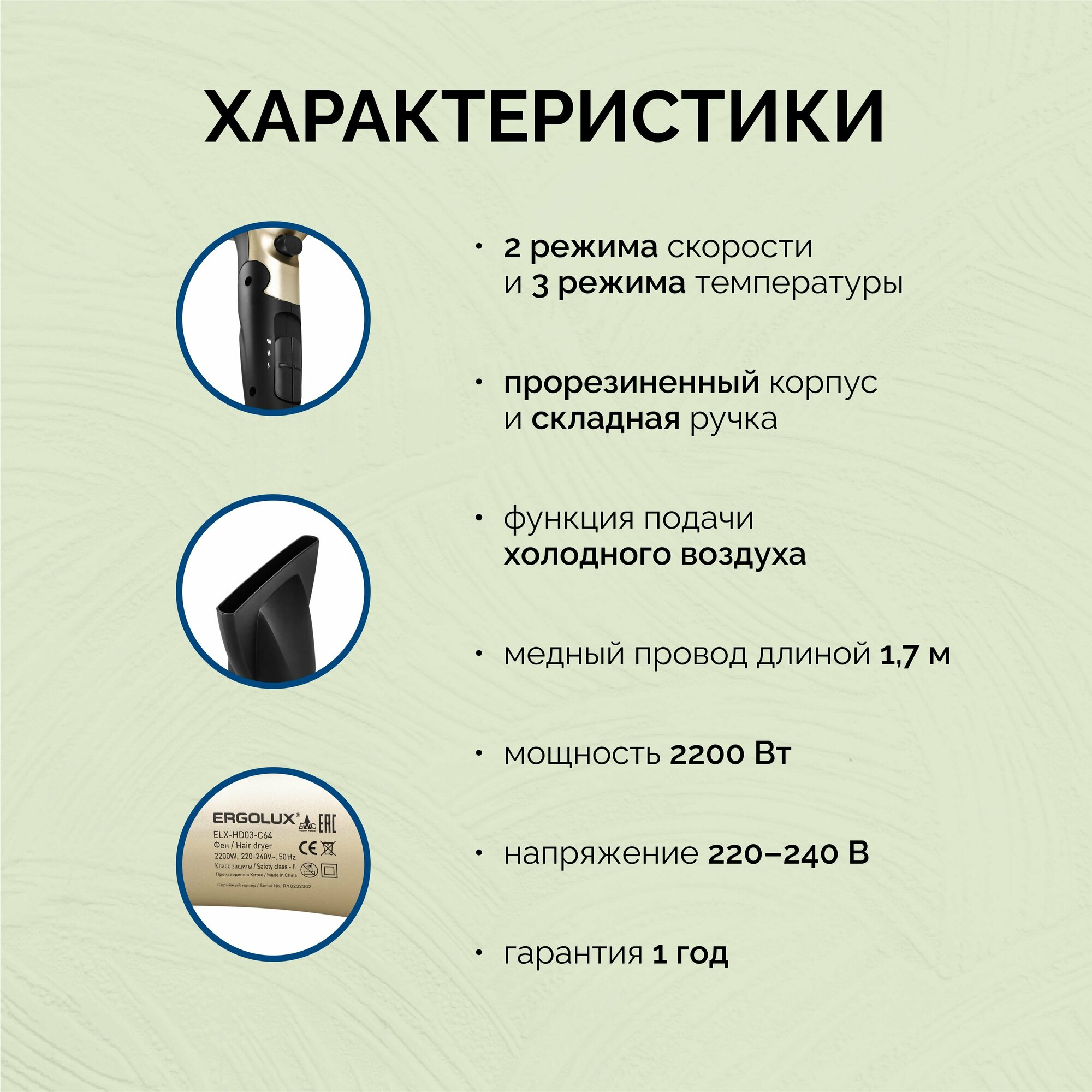 Фен со складной ручкой ELX-HD03-C64 черный/золото (2200Вт, 220-240В) ERGOLUX