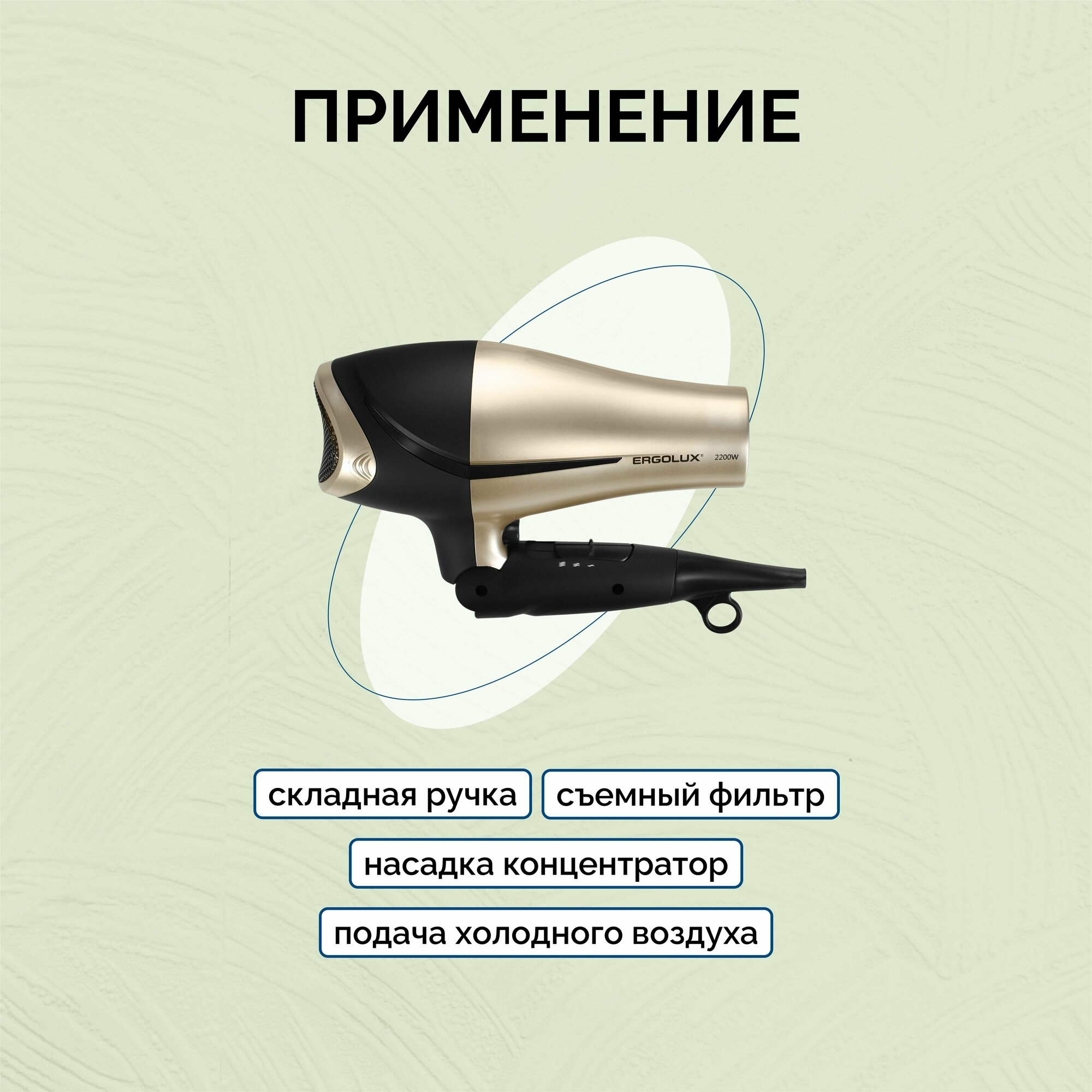 СохранитьПрофессиональный фен для сушки и укладки волос ERGOLUX ELX-HD03-C64 со складной ручкой 2200Вт арт.13131 интересное:
