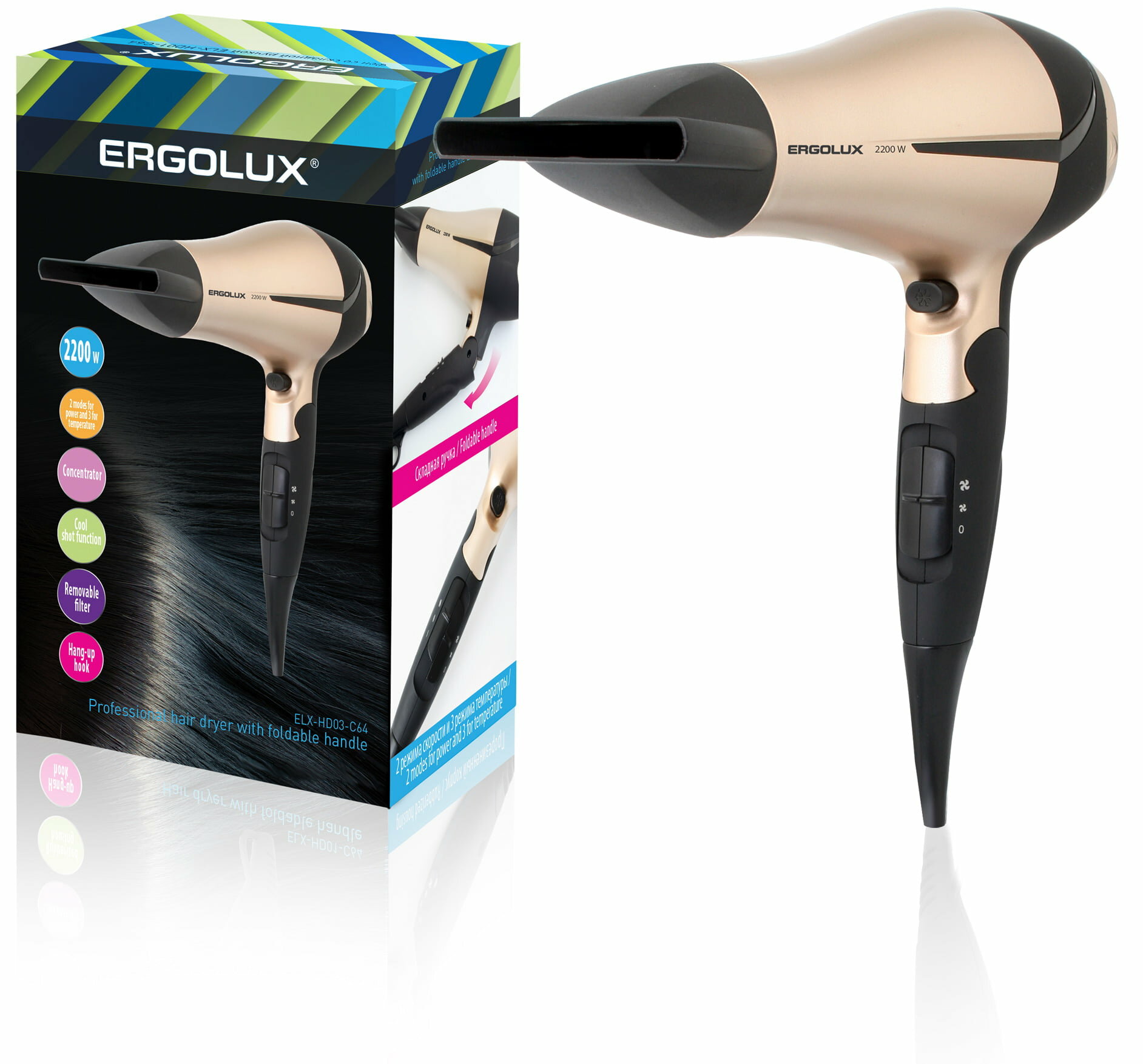 черный/золото (фен со складной ручкой, 2200Вт, 220-240В), ERGOLUX ELX-HD03-C64 (1 шт.)