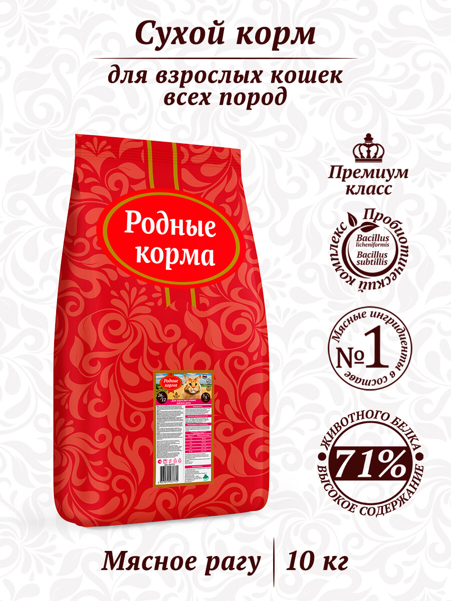 Сухой корм для кошек Родные Корма для взрослых кошек, мясное рагу, 10 кг
