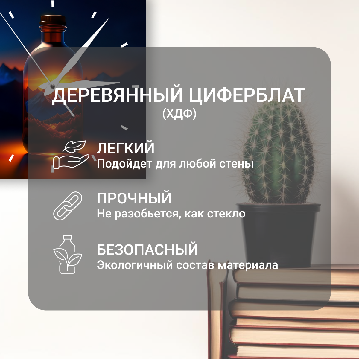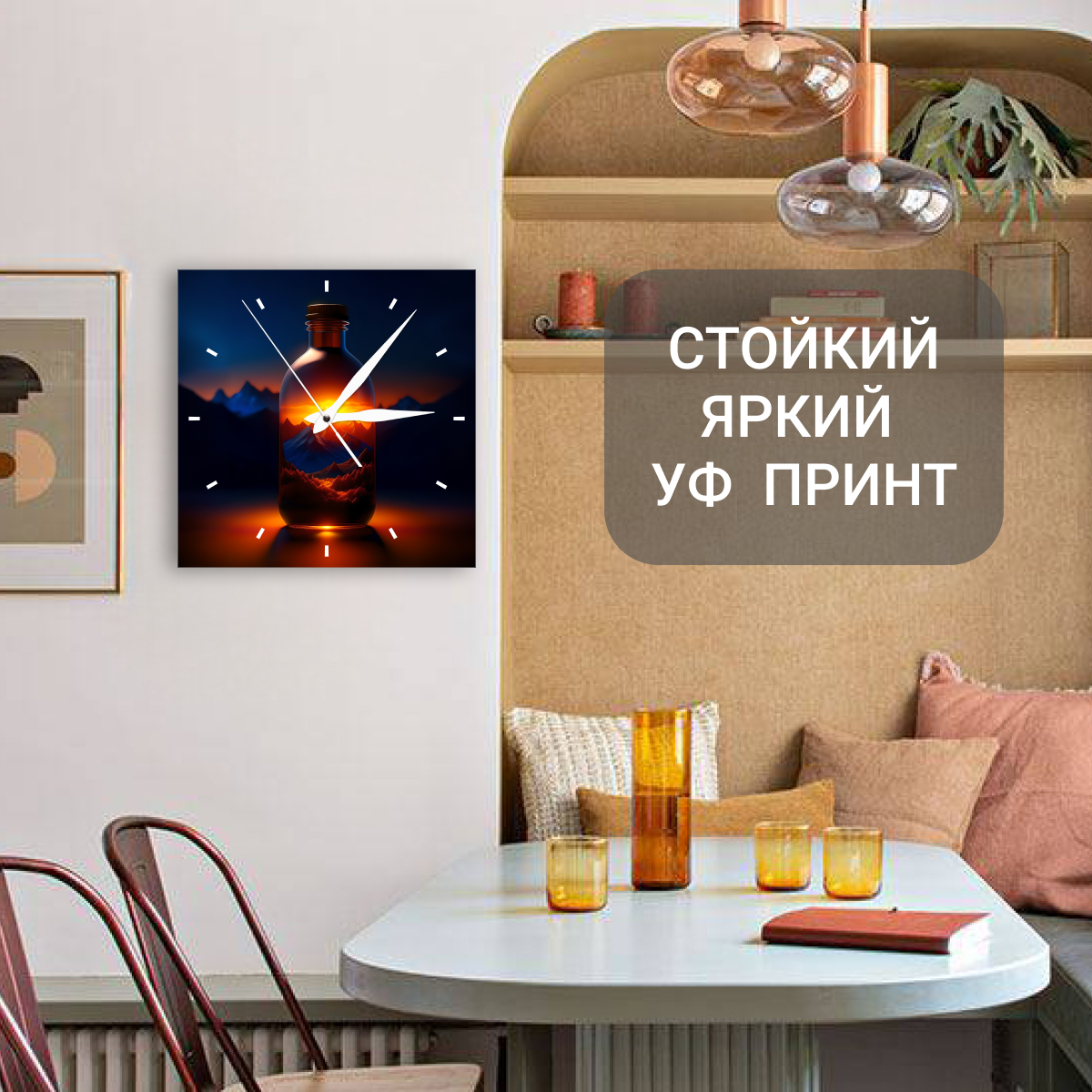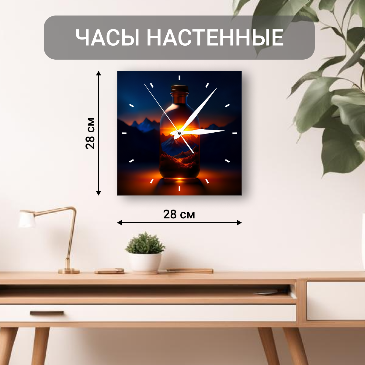 Деревянные настенные часы с УФ принтом 28см, бесшумные кварцевые интерьерные часы без стекла, открытые стрелки, в бутылке горы и рассвет интересное: