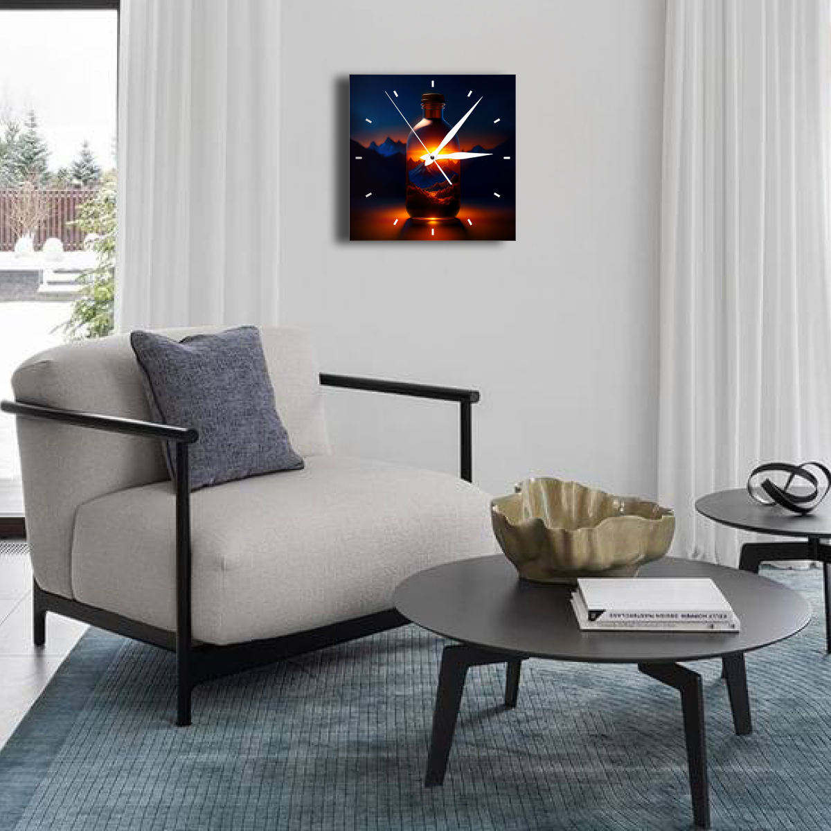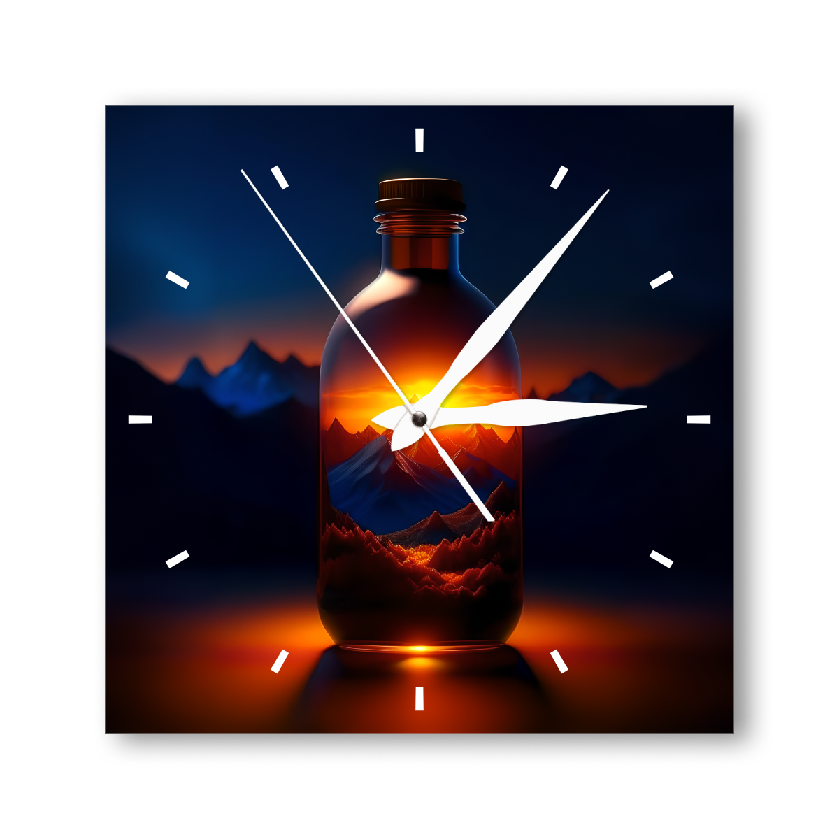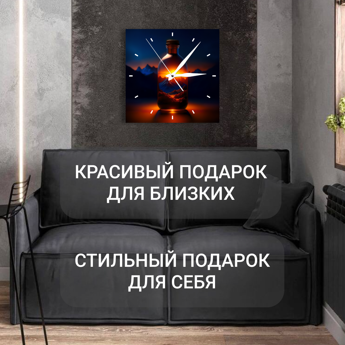 Деревянные настенные часы с УФ принтом 28см, бесшумные кварцевые интерьерные часы без стекла, открытые стрелки, в бутылке горы и рассвет интересное: