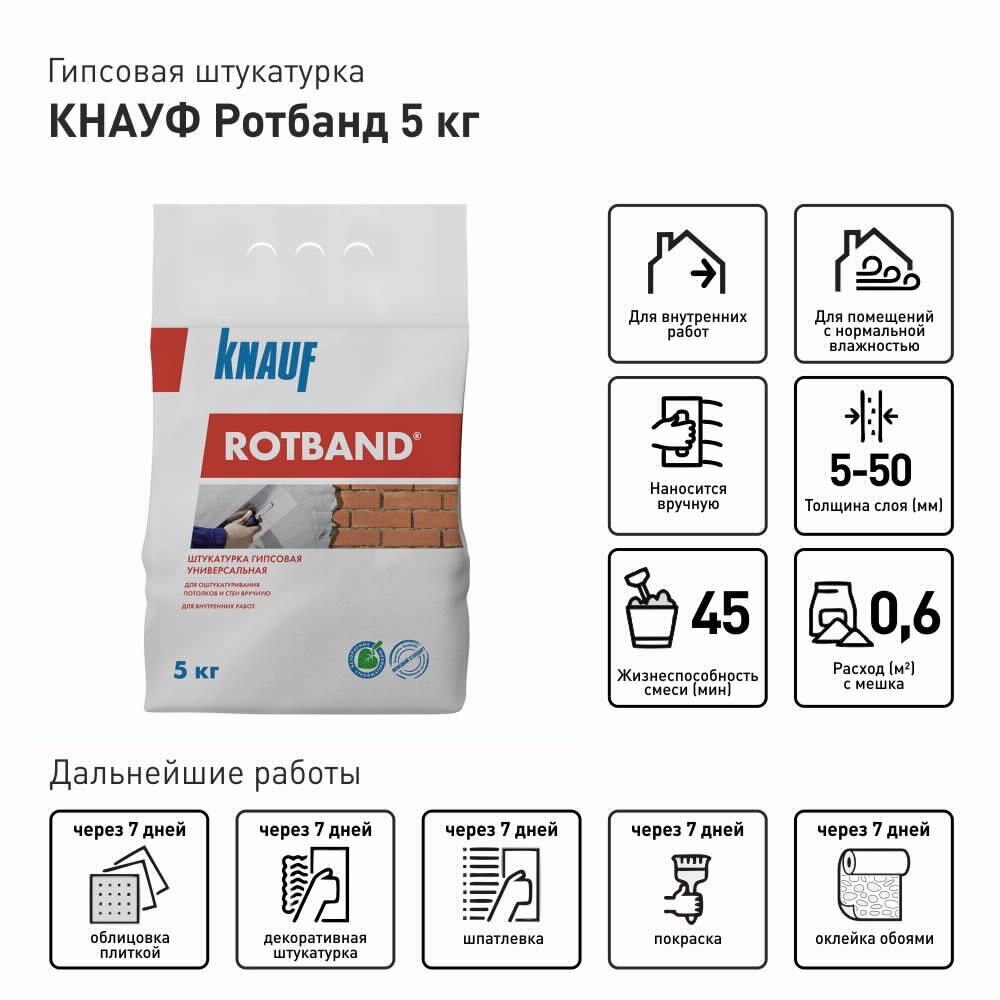 КНАУФ Ротбанд штукатурка гипсовая универсальная (5кг) / KNAUF Rotband штукатурка гипсовая для потолков и стен (5кг)