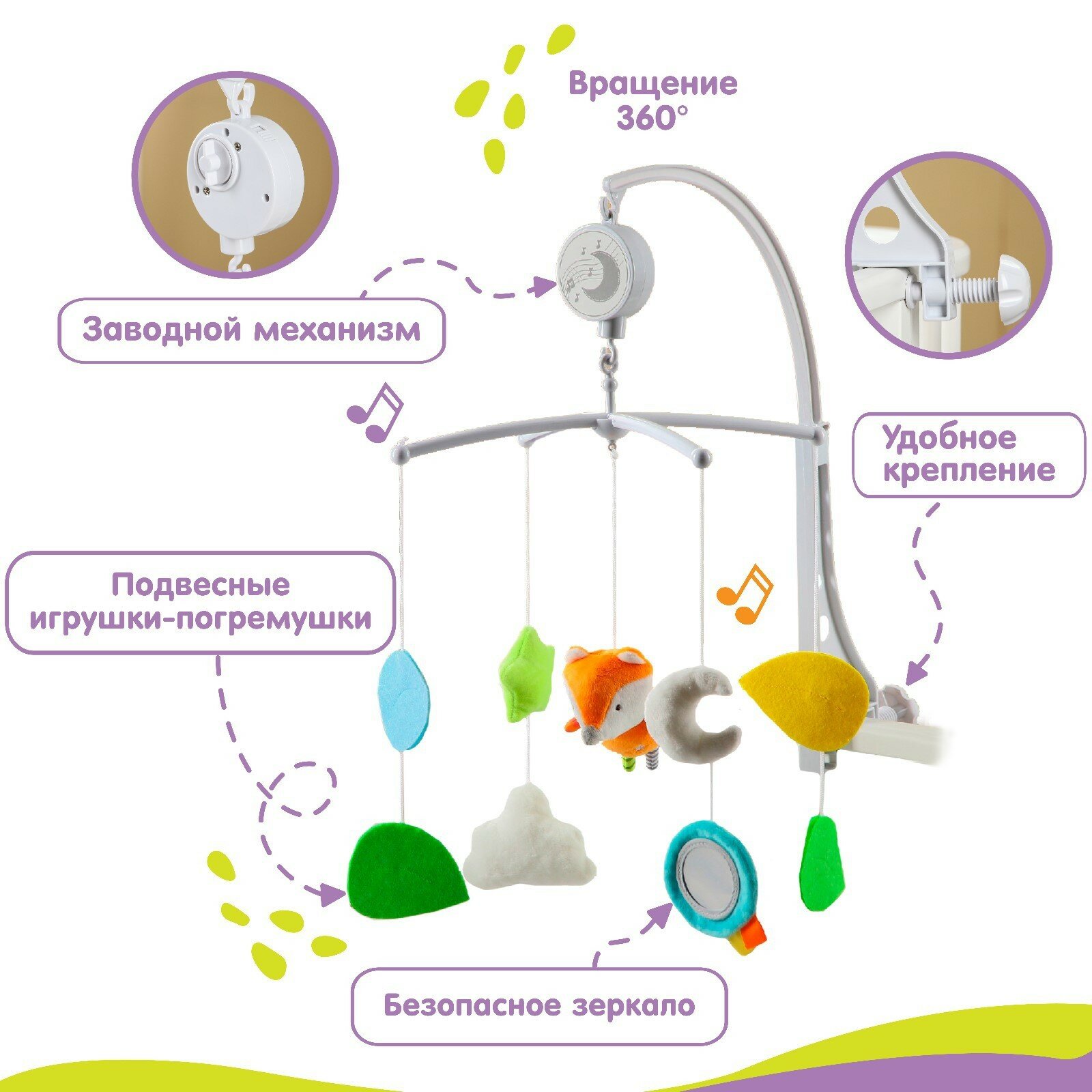 Мобиль музыкальный Лисенок, заводной, мягкие игрушки