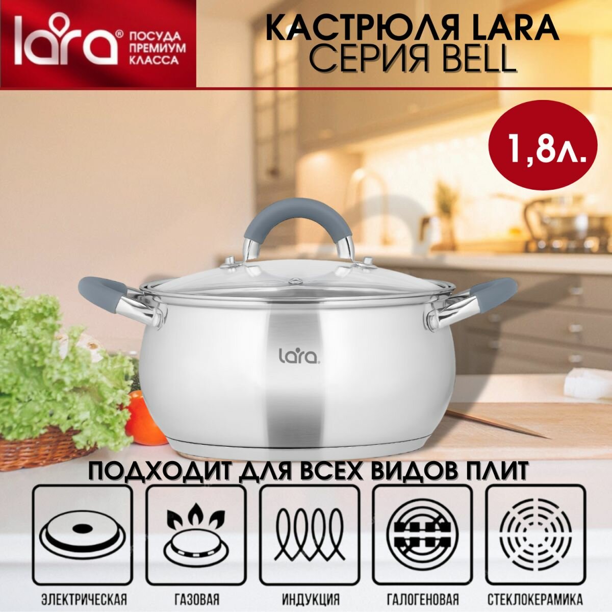 Кастрюля из нержавеющей стали 2,6л LARA LR02-481 - серия BELL, для индукционных плит, для всех видов плит, крышка