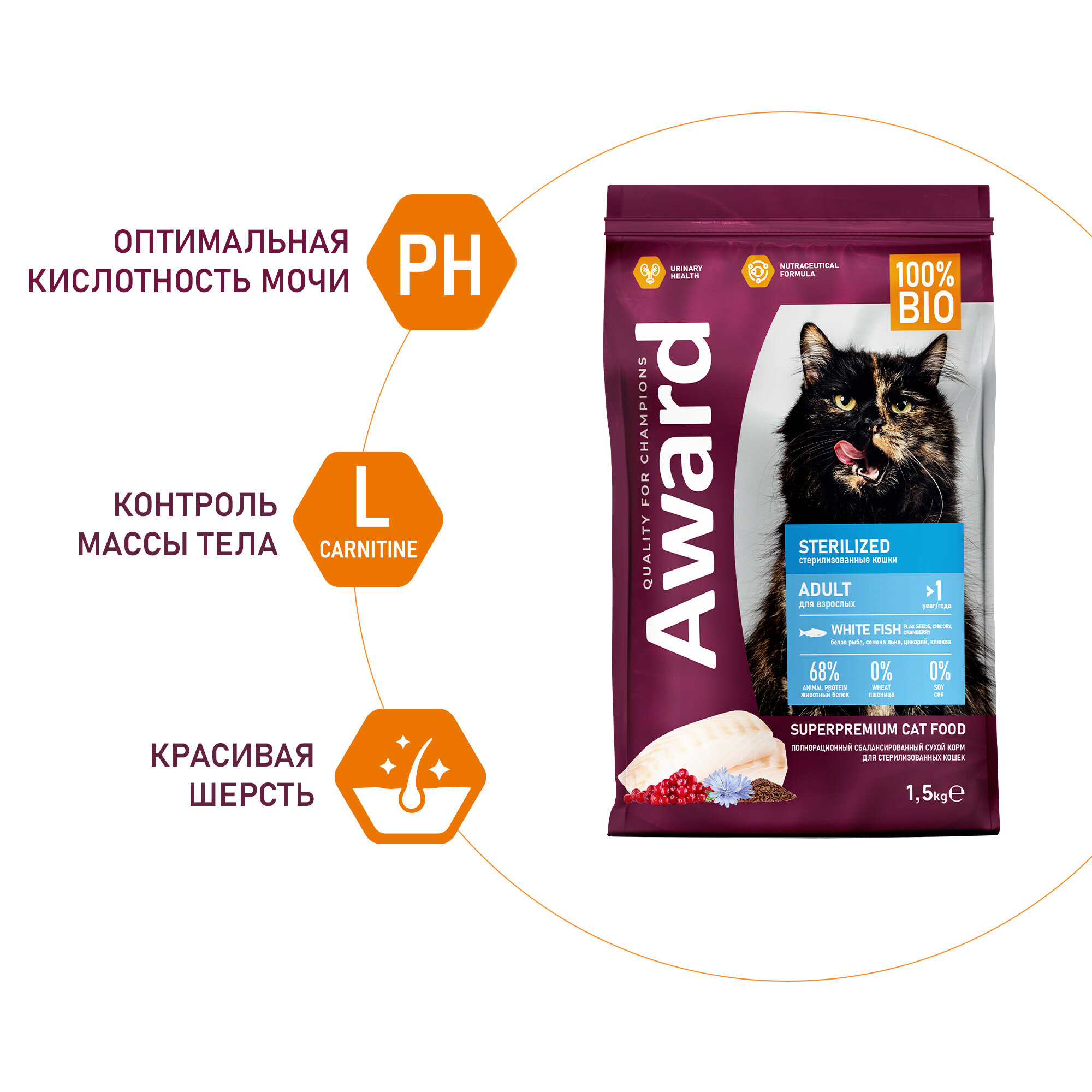 AWARD Sterilized Сухой корм для взрослых стерилизованных кошек с белой рыбой с добавлением семян льна, клюквы и цикория 1.5кг