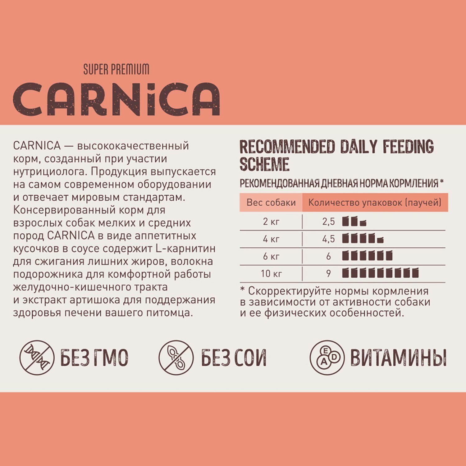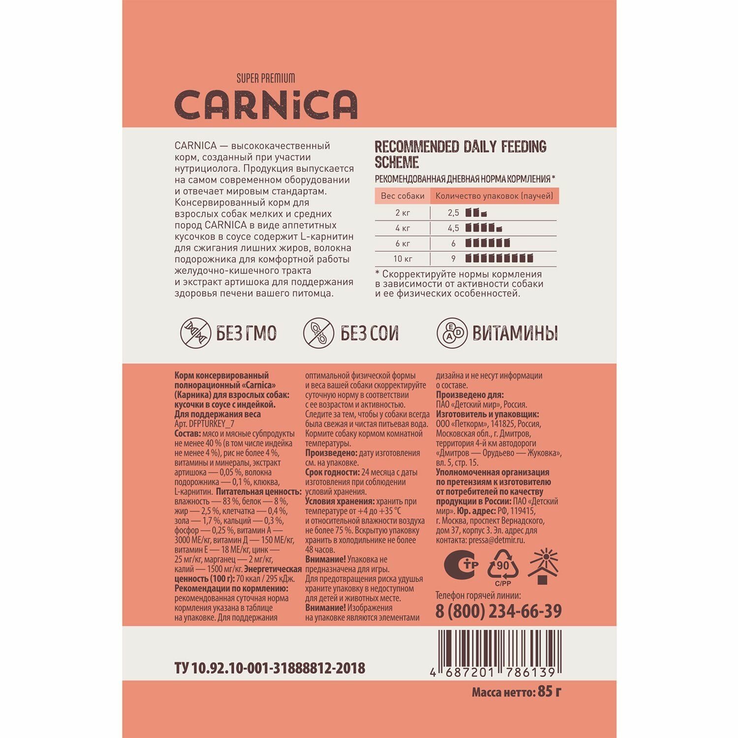 Купить Корм для собак Carnica 85г с индейкой для поддержания веса кусочки в соусе консервированный