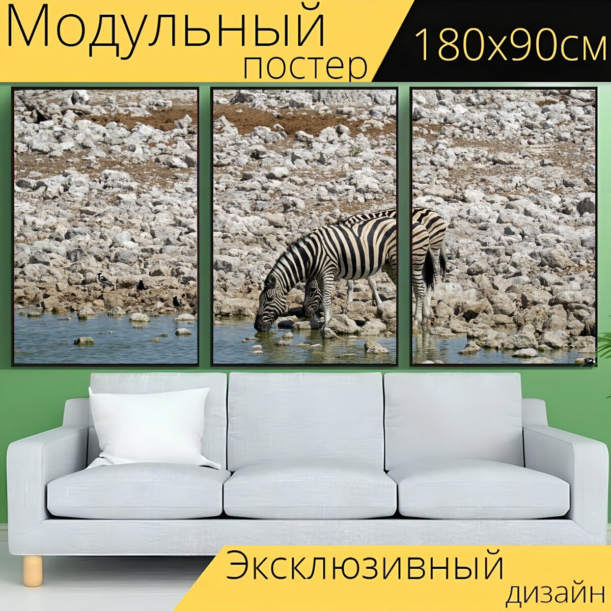 Модульный постер "Намибия, зебра, этоша" 180 x 90 см. для интерьера интересное:
