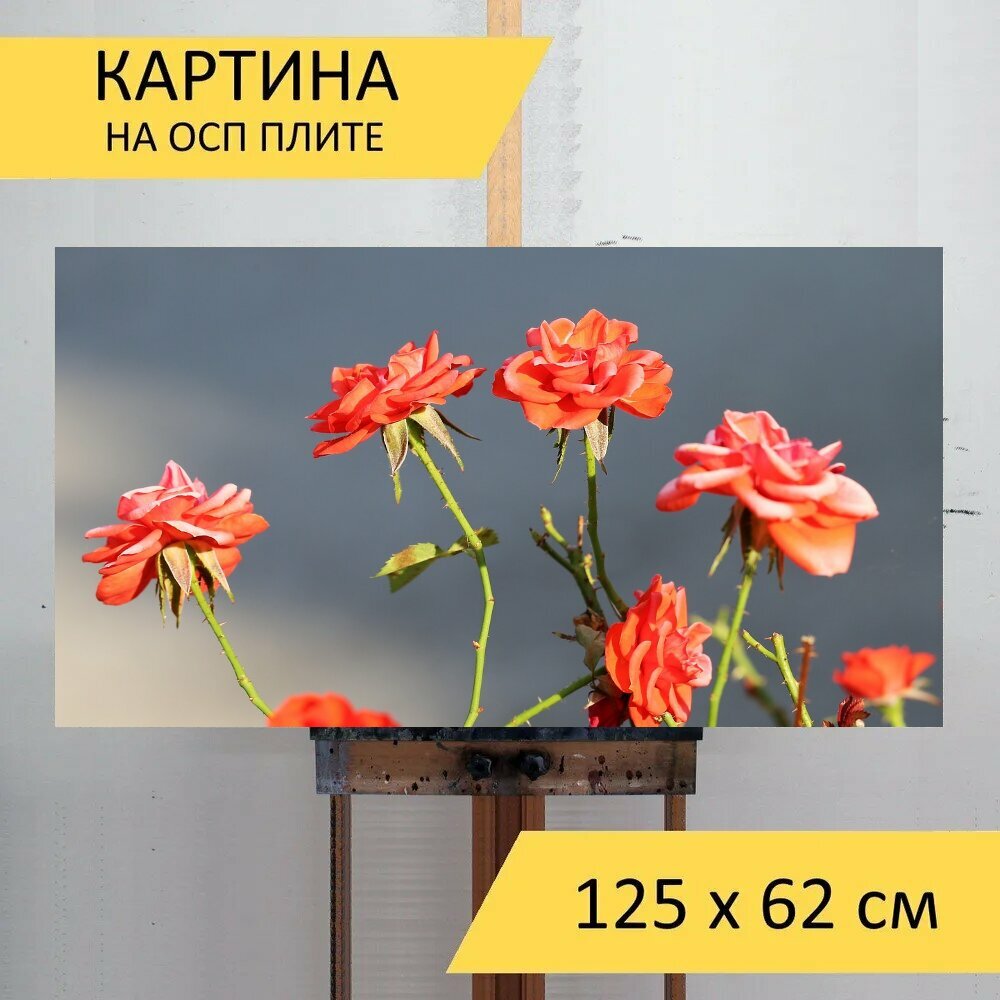 Картина на ОСП 125х62 см. "Красные розы, цветок, блум" горизонтальная, для интерьера, с креплениями интересное:
