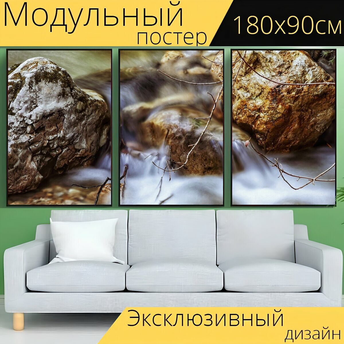 Модульный постер "Ручей, вода, камни" 180 x 90 см. для интерьера интересное: