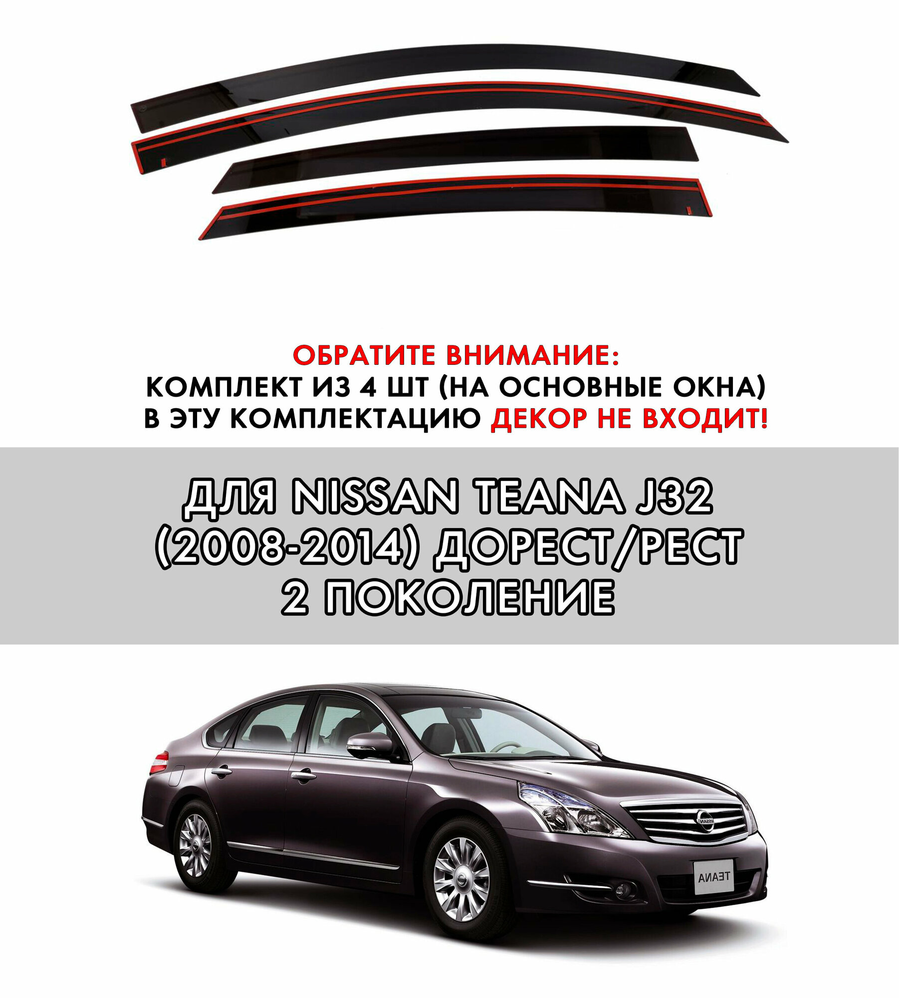 Плоские тюнинг дефлекторы для окон Nissan Teana J32 (2008-2014) / Ветровики 2d дефлекторы для окон Ниссан Тиана 2 поколение. Комплект 4 шт. интересное: