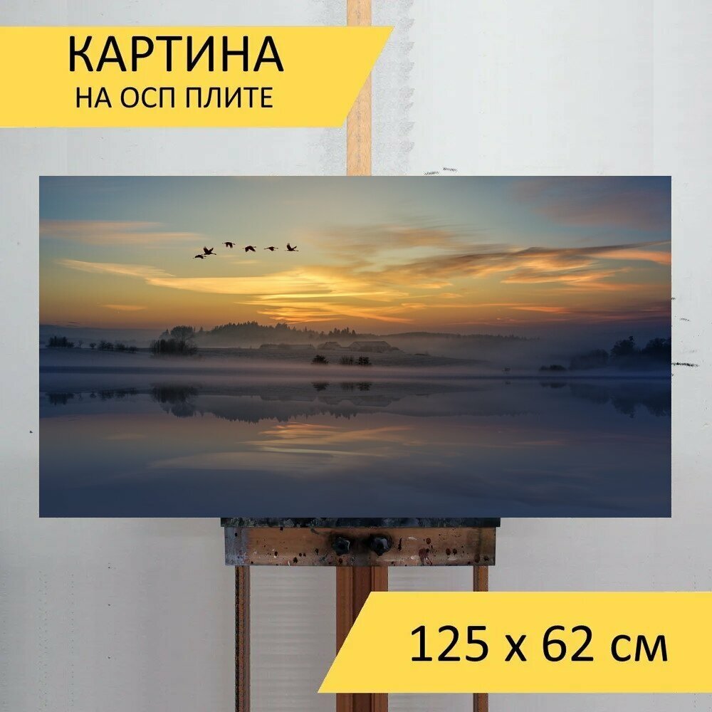 Картина на ОСП 125х62 см. "Заход солнца, облака, небеса" горизонтальная, для интерьера, с креплениями интересное: