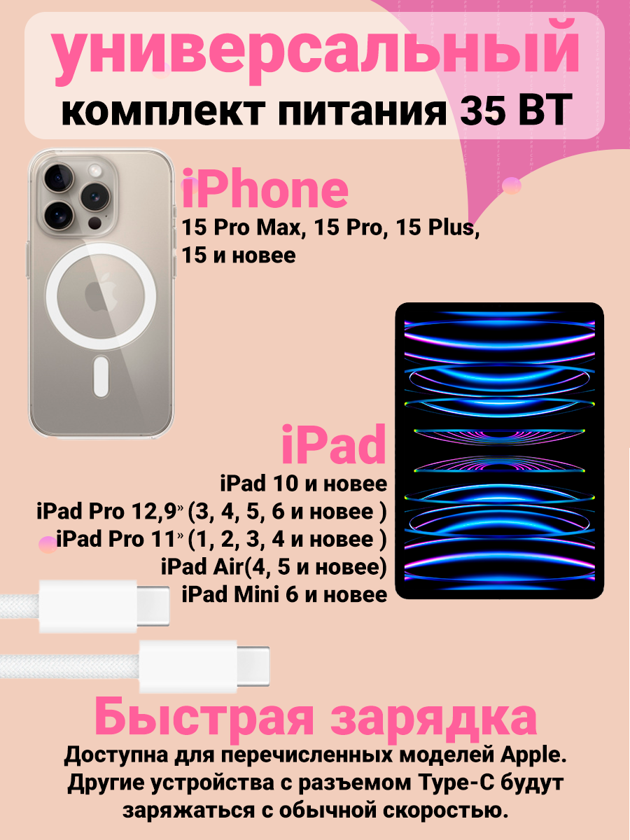 Сетевое зарядное устройство Premium Type-C 35W + плетеный кабель USB-C - USB-C, 2м для iPhone 15, iPad, AirPods интересное: