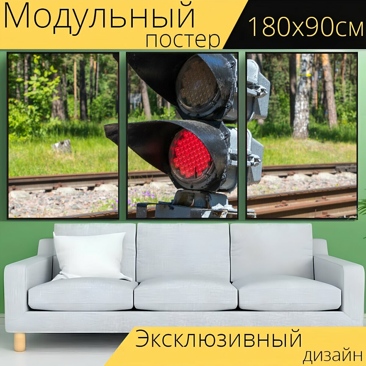 Модульный постер "Железная дорога, светофор, рельсы" 180 x 90 см. для интерьера интересное: