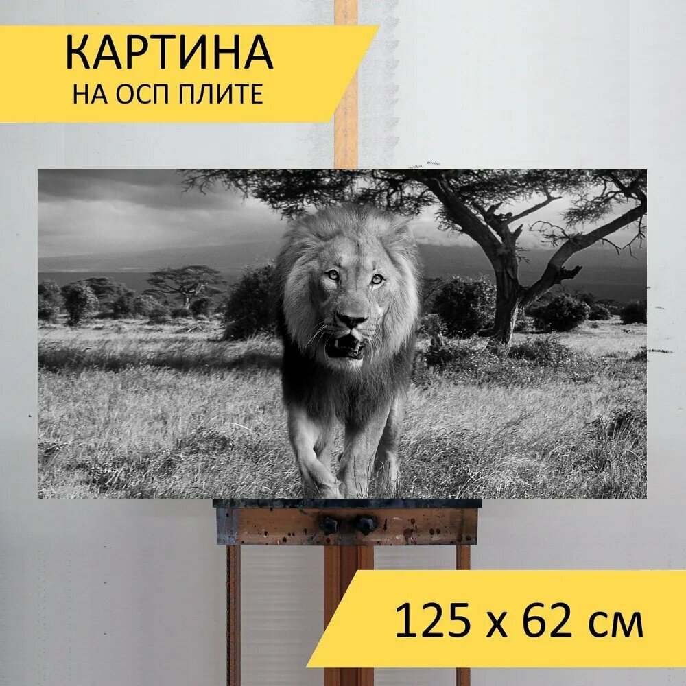 Картина на ОСП 125х62 см. "Лев, африке, дикий кот" горизонтальная, для интерьера, с креплениями интересное: