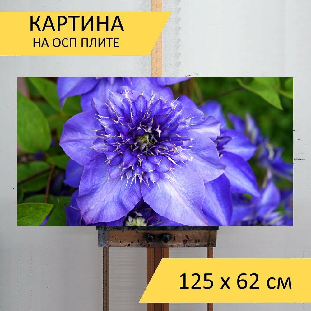 Картина на ОСП 125х62 см. "Клематис, синий, цвести" горизонтальная, для интерьера, с креплениями интересное: