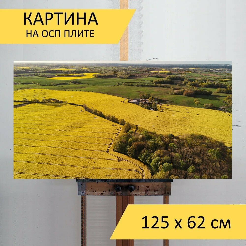 Картина на ОСП 125х62 см. "Рапс, поля, дрон" горизонтальная, для интерьера, с креплениями интересное: