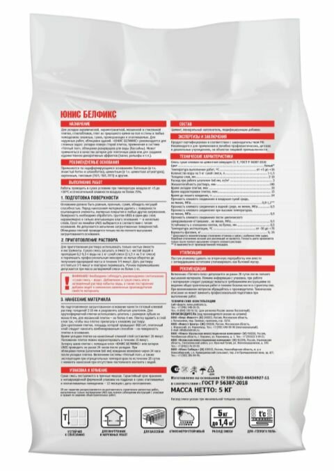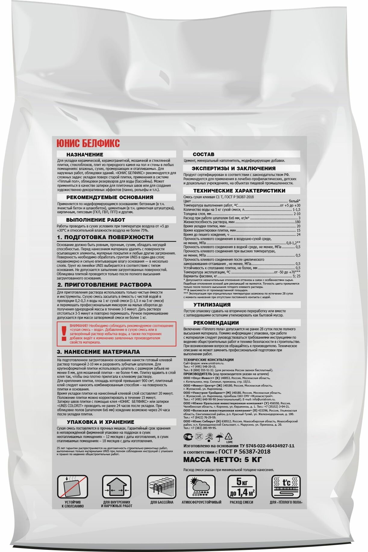 Плиточный клей UNIS белфикс белый, класс C1T, 5 кг 4607005181718