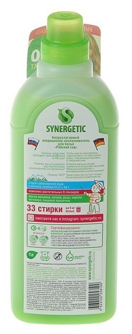 Кондиционер-ополаскиватель для белья SYNERGETIC "Райский сад", 1 л (33 стирки)
